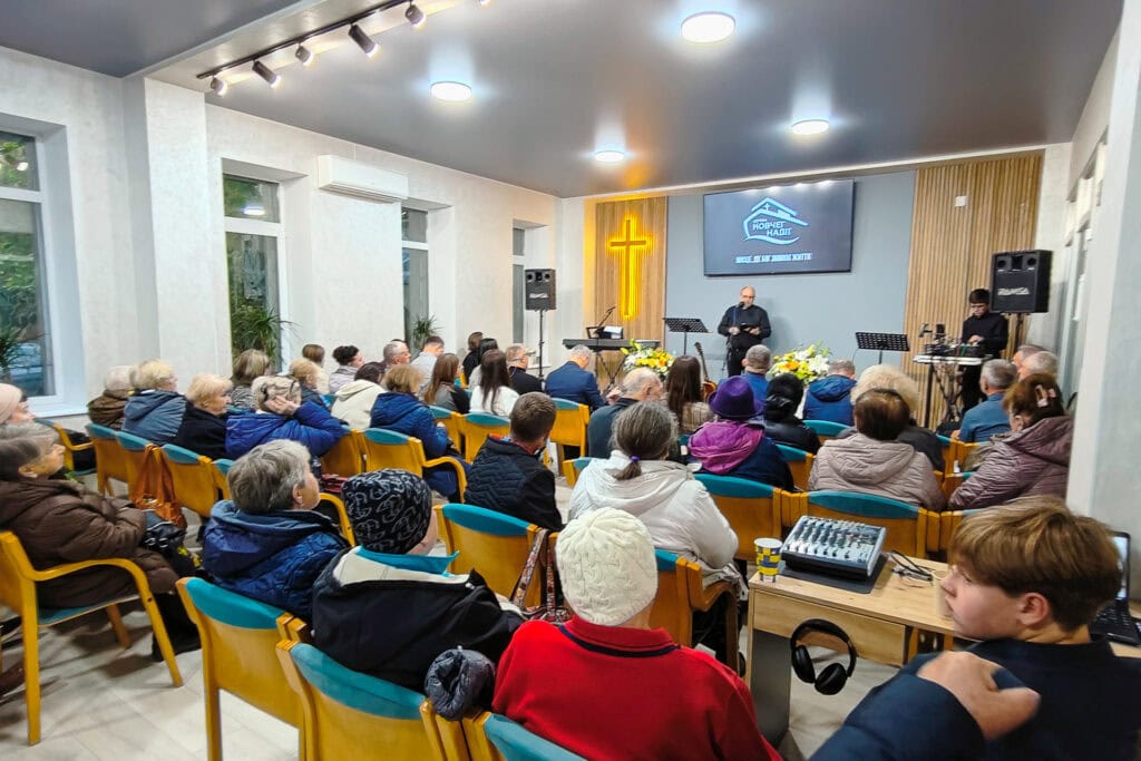 Heute besuchen über 60 Menschen den Gottesdienst – fast alle von ihnen sind Flüchtlinge aus verschiedenen Teilen der Ukraine.